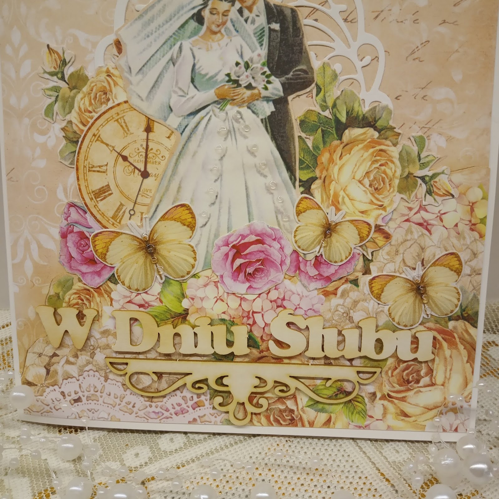 Do zrobienia jej użyłam kolekcji "Grow old with me" Lemoncraft. Para młoda wycięta jest z karty "Love of my life" od Lemoncraft. Do tego niezawodne zegary i motyle.